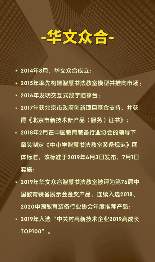 北京華文眾合科技有限公司(以下簡(jiǎn)稱“華文眾合”)是專注于智慧書法教育的國(guó)家高新技術(shù)企業(yè),是《中小學(xué)智慧書法教室裝備規(guī)范》團(tuán)體標(biāo)準(zhǔn)的提出單位和牽頭制定單位。