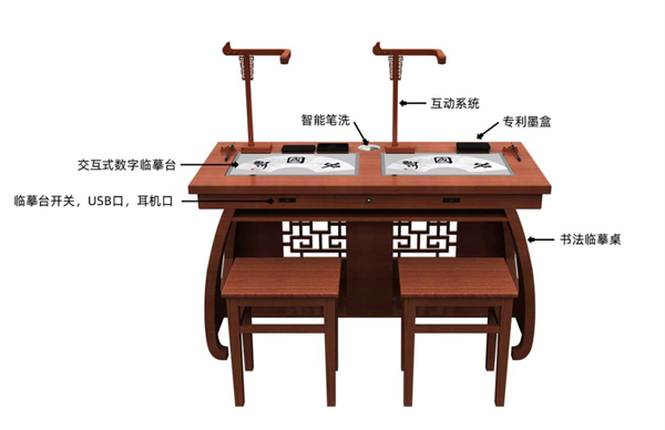 書法臨摹桌是學生使用的硬件一體的實木古典書桌,每張桌子(以至尊版桌子為例)鑲嵌兩個交互式數字臨摹臺、兩個互動系統、兩個專利墨盒、一個筆洗,桌子內側設有洗筆器按鈕、交互式數字臨摹臺開關按鈕、USB接口和耳機口。