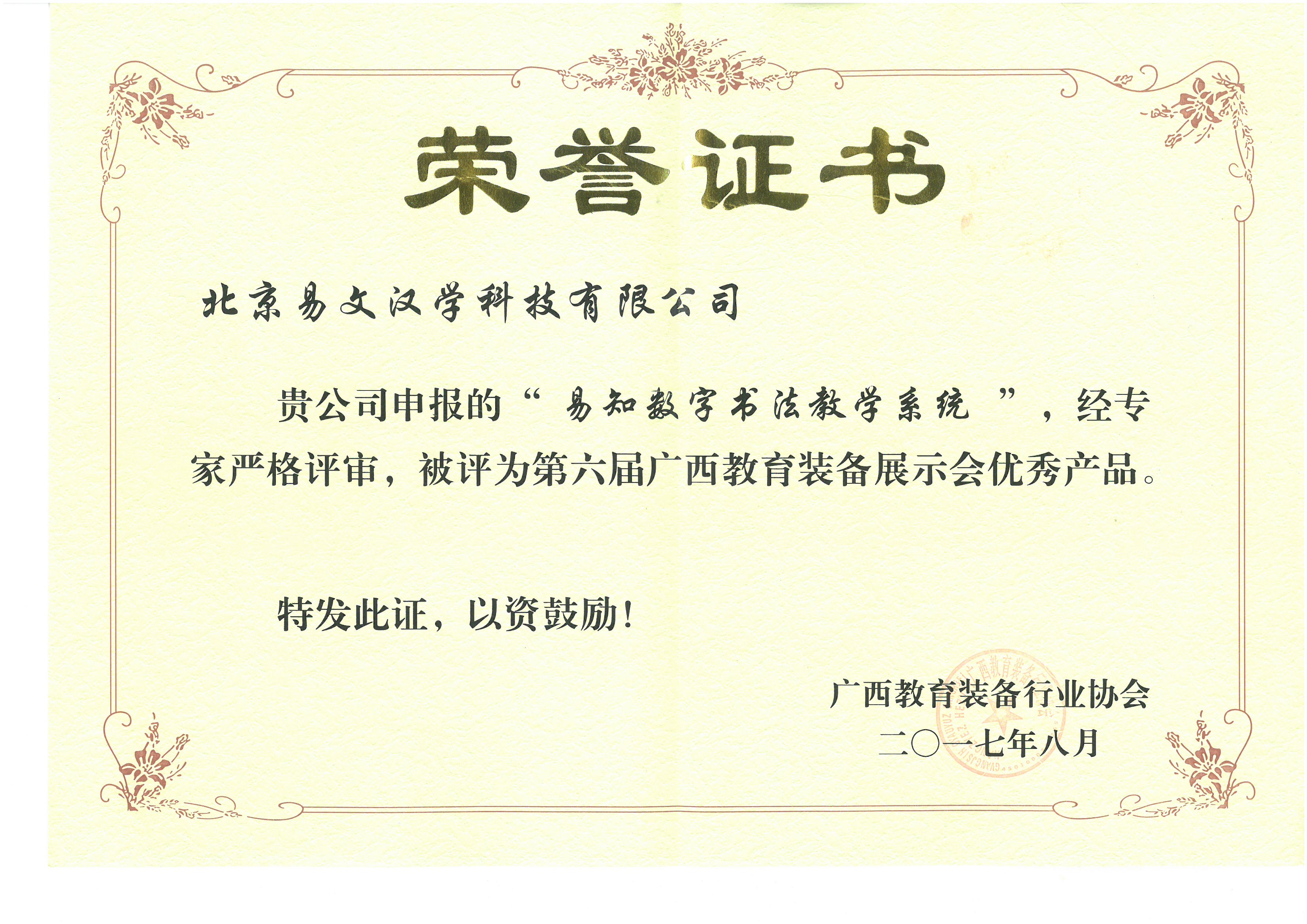廣西教裝行協優秀產品證書