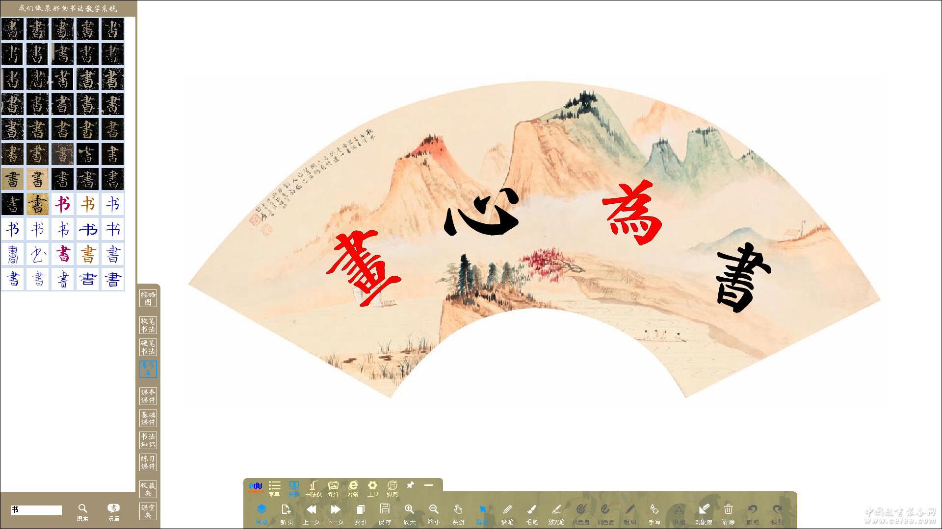 2. 軟筆筆畫教學: 從碑帖單字中一鍵提取任意筆畫,在原帖上進行原帖摹寫、單鉤摹寫、雙鉤摹寫與原字摹寫四種摹寫教學方式以及筆勢講解,任意筆畫都具備在原帖上進行示范動畫。 3. 碑帖單字教學: 提取碑帖字的單鉤、雙鉤及筆畫筆勢進行講解,一鍵顯示單字全部筆畫及筆順,并具有一鍵轉換為原帖摹寫、單鉤摹寫、雙鉤摹寫、原字摹寫四種摹寫教學方式同時配備單字原帖示范動畫及名家書寫雙路示范視頻。 4. 碑帖單字結構教學: ① 可提取碑帖單字中的任意筆畫進行點畫講解,拆分單字進行不同筆畫的輪廓化、填色等結構組合;配合使用內置九宮格、米字格、回米格等書法專用圖形格,教師可進行原字的參照及點畫的布局操作。 ② 點畫關系與字型結構的互動教學。學生可以在電子白板/教學一體機上體會點畫與點畫之間的位置關系;采用不同顏色輪廓化的筆畫,讓學生進行自主搭配組合,加強對字型結構的認知。 5. 章法教學: 筆畫、單字與原帖相互提�。簡巫值奖�、單字到筆畫、筆畫到原碑帖、碑帖到單字相互提取。講解筆畫在單字、單字在原帖中的章法關系,及碑帖賞析與講解。 6. 軟筆書體教學: 可一鍵呈現單字在綱要規定的臨摹范本推薦的顏、柳、歐、趙、褚,楷書碑帖字及全息手寫字庫中的全部字例,對碑帖中所有同字的相同點畫進行造型、筆法分析,以及不同結構特征的比對講解,智能書法筆仿真書寫綱要臨摹范本推薦的顏、柳、歐、趙、褚楷書碑帖字,書寫仿真度高。 7. 同字比對教學: 碑帖單字具有“同字比對”功能,可一鍵找到綱要規定的顏、柳、歐、趙、褚臨摹范本中的同一個字的全部字例,針對碑帖中所有同字的相同點畫進行造型、筆法分析,以及不同結構特征的比對講解,讓學生們感受到漢字不同之美。 8. 書寫比對教學: 可一鍵呈現單字在綱要規定的臨摹范本推薦的顏、柳、歐、趙、褚,楷書碑帖字中的全部字例,對碑帖中所有同字的相同點畫進行造型、筆法分析,以及不同結構特征的比對講解,智能書法筆仿真書寫綱要臨摹范本推薦的顏、柳、歐、趙、褚楷書碑帖字,書寫仿真度高。 9. 教師書寫示范: 書法教師在課堂進行書寫示范時,可通過書法教學儀直接在電子白板\觸控一體機上展示教師的書寫技法。 10. 書寫參照互動教學: 任意形式的教學內容都可以一鍵提取到書法儀頁面下作為書寫示范的參照,參照窗口與書寫窗口可進行移動及縮放。 ① 筆畫、單字、碑帖等軟筆教學資源以及硬筆楷書矢量化字庫的任意單字,可直接跳轉到書法儀下進行臨寫示范的參照; ② PPT、Word、視頻、動畫、圖片等教學資源也可直接作為書寫示范的參照; ③ 顯示屏幕上任意位置的教學內容都可一鍵截取到書法儀下進行參照; ④ 作業、掛圖、課本等紙質資源可直接抓取到參照窗口。 11. 書法教學儀16C: 書法教學儀16C具有500萬像素,超A2幅面書寫展示范圍,最高幀率可達30幀/秒。書法教學儀清晰展示書寫過程中毛筆筆鋒的變化與軌跡、運筆和運腕的變化。 12. 智能書法筆: 教師可以在紅外、電磁、電容、電阻、光學、光波、超聲等各種類型電子白板/教學一體機上仿真書寫綱要中臨摹范本推薦的顏、柳、歐、趙、褚楷書碑帖字,書寫仿真度高。 13. 支持漢語偏旁部首教學: 針對大綱的要求和低年級寫字課學習的特點,軟件提供國標編碼標準的8953個漢字的硬筆楷書矢量化字庫與偏旁部首矢量化字庫,方便教師進行低年級硬筆楷書筆畫與偏旁部首教學。 14. 支持硬筆單字講解: 系統提供單字講解、單字注摹、單字臨摹三種單字教學書法模板,教師可選擇不同模板進行各學段的硬筆楷書單字教學。單字講解以硬筆單字為核心,可提取單字筆畫、分解筆畫、并提供了示范動畫供教師使用;單字注摹提供了漢語拼音、筆順提示、提取筆畫、分解筆畫和示范動畫演示;單字臨摹支持進行硬筆單字的臨摹與摹寫教學。 15. 支持硬筆字型結構教學: 可將手寫字庫中所有硬筆單字一鍵提取任意單字筆畫,進行筆畫分解,通過輪廓化、填色等不同方式的組合進行結構講解。 16. 支持硬筆單字搜索與書體教學: 配備GB2312-80與GB12345-1990編碼標準的手寫標準楷書、手寫鋼筆楷書、手寫鋼筆顏楷、手寫鉛筆顏楷、手寫標準細篆、手寫隸書等硬筆全息書法字庫,完全包含國務院公布《通用規范漢字表》的一、二級常用字,可通過搜字庫查字搜索,便于單字的進行不同書體教學。 17. 支持不同年級的詞組 、短文教學: 系統配備了首字注摹、 注音摹寫、注音臨摹三種詞語教學模板,滿足了教師編輯各年級不同類型的語文詞組教學的需求。 首字注摹是指對第一個漢字進行注音、摹寫,可以輸入多個漢字,支持所有單字進行摹寫,書寫框內提示第一個字的注音、筆順、筆劃數等信息,方便了解漢字在詞組中的寫法; 注音摹寫是指對書寫格內所有漢字進行注音,同時支持對漢字進行摹寫; 注音臨摹,顧名思義是指標注漢字的注音,可以對漢字進行臨寫和摹寫。 18. 一鍵關聯成語、常用短語教學 支持將軟硬筆的文本輸入框內任意單字選中,可一鍵顯示單字的所有相關成語、常用短語等,便于教師重點講解單字時根據課程需要隨時引申入有趣的成語、常用短語、俗語知識,增加學生詞匯量。 19. 一鍵簡繁體互換教學 軟硬筆的簡繁體一鍵互換的功能方便教師授課時能方便、正確的講解任意