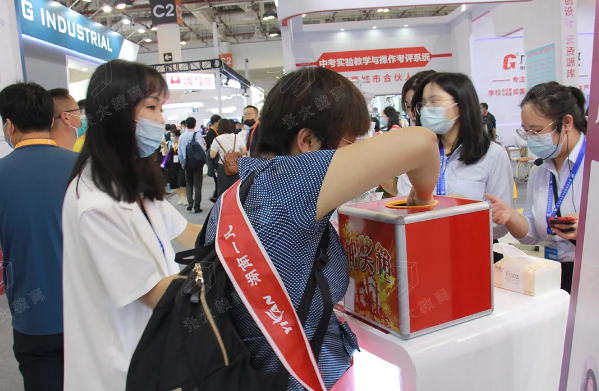 光大教育的展位上,一張印著“速來抽獎”的展架引人注目,來往的嘉賓都樂意停下腳步,掃碼關注光大教育的公眾號,免費獲取抽獎機會。