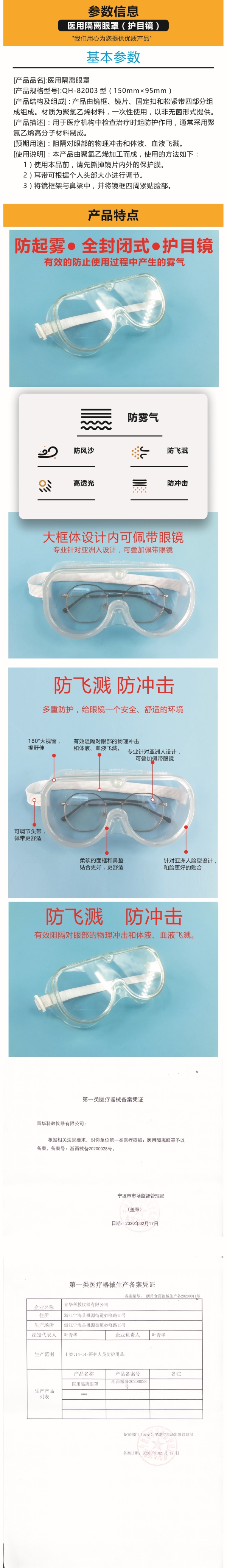 青華科教所產的醫用隔離眼罩由鏡框、鏡片和頭帶組成。鏡框為食品級聚乙烯材料,一次性使用,以非無菌形式提供。用于疫情防御和醫療機構中檢查治療時起防護作用,阻隔對眼部的物理沖擊和體液、血液飛濺。該醫用隔離眼罩,有間接通風口設計,更可靠的聚碳酸酯鏡片,能有效防護沖擊傷害,防霧涂層可防止鏡片起霧,內部可疊加佩戴眼鏡,柔軟的面框和鼻墊貼合能更好地貼合臉部,180°大視窗,視野佳,可調節式頭帶,佩戴更舒適。