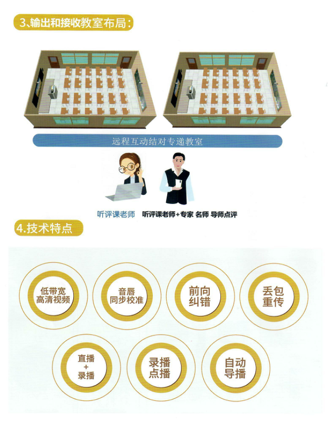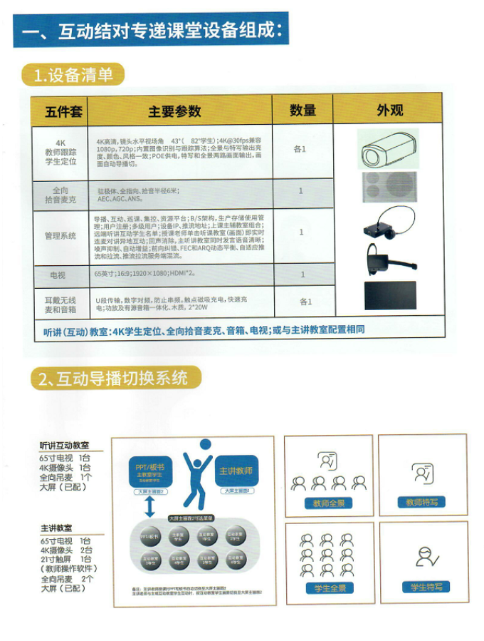 成都市教育技術裝備管理中心數字化校園互聯網,成教技發〔2019〕69 號、成教技發〔2019〕138 號、智慧教育2019年好方案產品獎;支持1個主講端和N個聽講端形成美育課互動結對課堂(專遞課堂),由攝像機、360度全向麥、接收端教室切換臺、音箱、互動型音頻處理器、結對同步互動系統組成;主講教師攝像機帶追蹤功能,特寫雙碼流和全景雙碼流,RTMP推流,直播教研、同步課堂互動教學、預覽、視頻錄制存儲;音頻處理器支持全頻帶全雙工自適應回聲消除技術;全頻帶動態自適應降噪技術;智能混音和話筒優選技術;支持6路線性輸出; 21英寸觸摸式,支持控制錄播系統的錄制、暫停、停止、VGA鎖定、手自動切換等操作;預覽通道選擇畫面布局切換:畫中畫、師生對話、三分屏;同步教學,美術教師特寫、教師全景、學生特寫、學生全景、板書、PPT畫面一鍵切換;實時互動:主講端教師和聽講端學生在線實時交流;高清:高清音視頻教學互動;堆疊提供平均載量的超級算法,無延時、唇音同步; 支持雙屏多屏幕、多視頻窗口切換、全智能終端接入。實時導播、畫面預覽、資源儲存、遠程互動等功能高度集成,1根標準網線即實現信號控制、供電同傳。