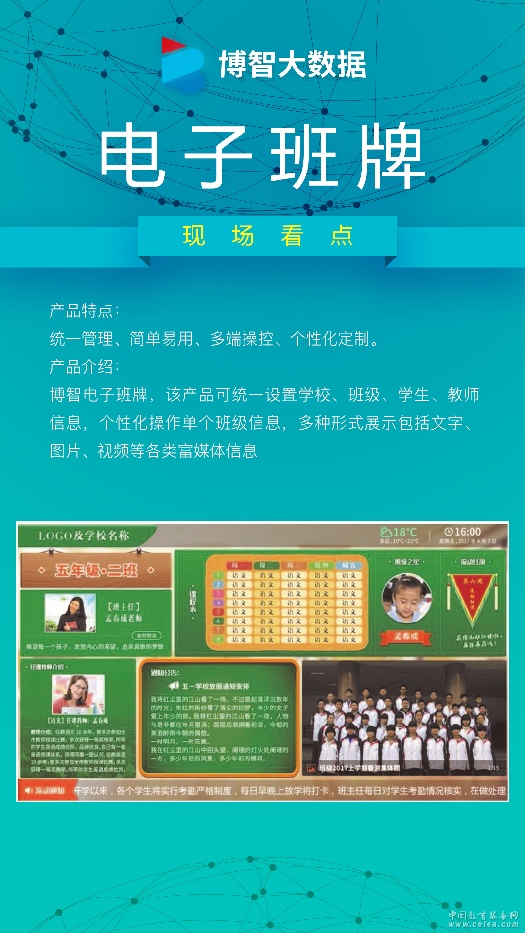 產(chǎn)品詳細(xì)介紹博智電子班牌,該產(chǎn)品可統(tǒng)一設(shè)置學(xué)校、班級(jí)、學(xué)生、教師信息,個(gè)性化操作單個(gè)班級(jí)信息,多種形式展示包括文字、圖片、視頻等各類(lèi)富媒體信息。 產(chǎn)品特點(diǎn): 統(tǒng)一管理、簡(jiǎn)單易用、多端操控、個(gè)性化定制。