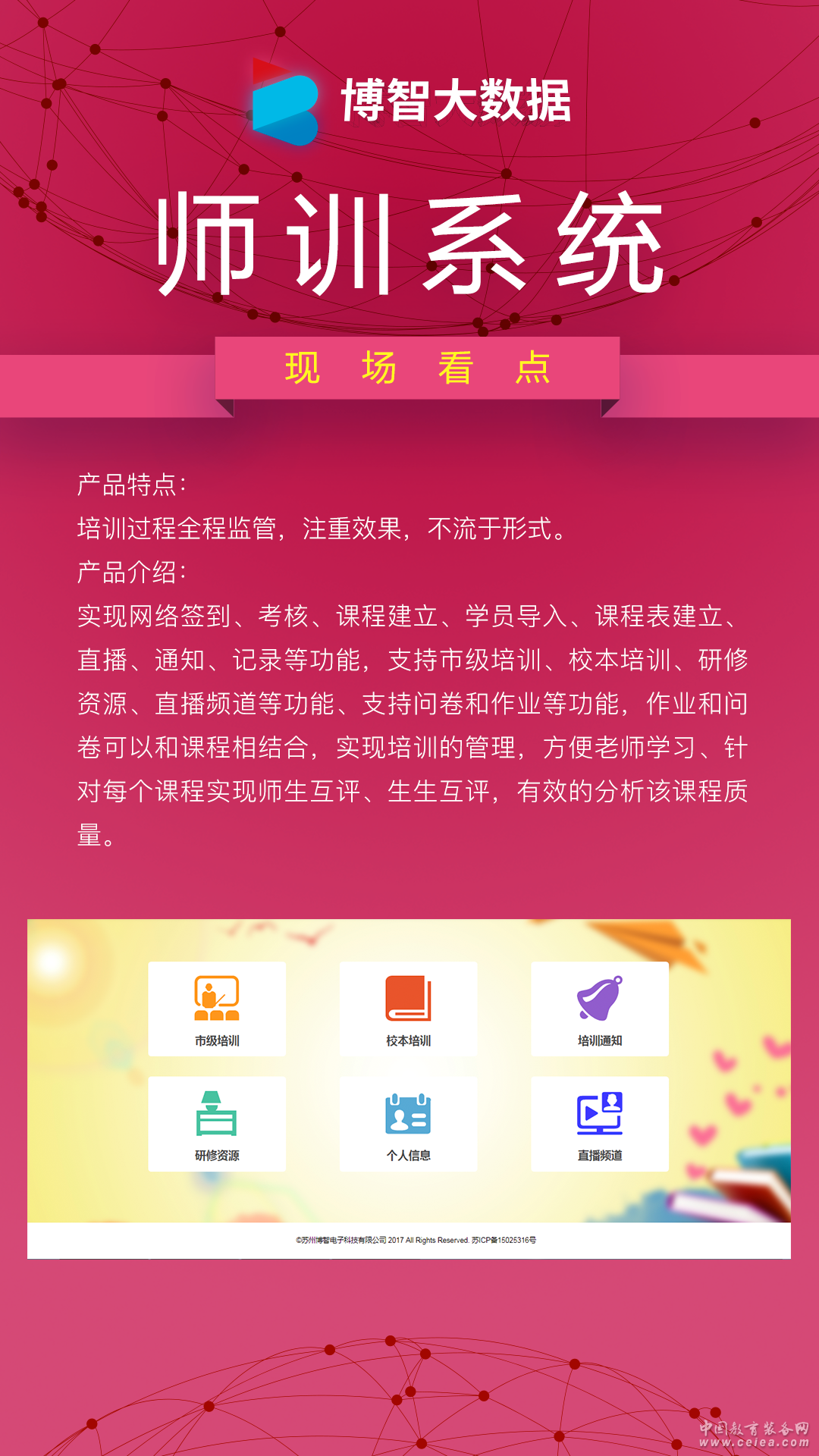 產品詳細介紹實現網絡簽到、考核、課程建立、學員導入、課程表建立、直播、通知、記錄等功能,支持市級培訓、校本培訓、研修資源、直播頻道等功能、支持問卷和作業等功能,作業和問卷可以和課程相結合,實現培訓的管理,方便老師學習、針對每個課程實現師生互評、生生互評,有效的分析該課程質量。 產品特點: 培訓過程全程監管,注重效果,不流于形式。