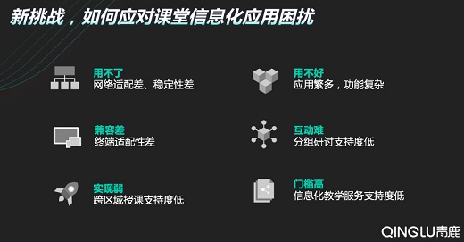 雖然課室配備了各式各樣的信息化設備,但是從實際教學開展過程中,包括從大量用戶的反饋中青鹿了解到,“用不了、用不好、兼容差、互動難、實現(xiàn)弱、門檻高”成為當前課堂實踐中的6大痛點。