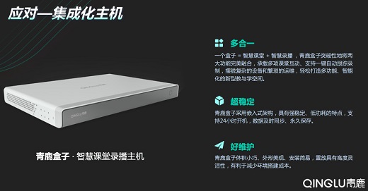 智慧錄播”的創(chuàng)新概念,自主研發(fā)智慧課堂錄播主機——青鹿盒子,其具有強穩(wěn)定,低功耗的特點,無需專人維護。同時,它體積小巧,有利于減少環(huán)境搭建成本,創(chuàng)設智能化教學環(huán)境更加簡便。