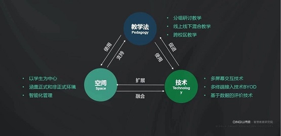 理念)。在青鹿智慧教室中,教學(xué)法為技術(shù)與學(xué)習(xí)空間相結(jié)合提供了行動(dòng)指南,開(kāi)放式的學(xué)習(xí)空間促進(jìn)教學(xué)法創(chuàng)新并使信息技術(shù)手段內(nèi)嵌于其中,而信息技術(shù)又增強(qiáng)了教學(xué)法的效果,并突破了傳統(tǒng)學(xué)習(xí)空間的局限。