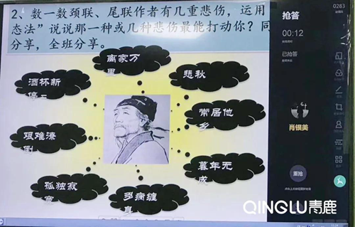 領導致辭結束后,江陽職高的宋老師與兩校的同學們應用青鹿多點互動智慧教室,上了新學期第一節(jié)異地同步語文課。與傳統(tǒng)的遠程直播課不同,這節(jié)遠程語文課能讓遠在700公里之外的鹽源職中的同學們充分參與到課堂的互動當中。