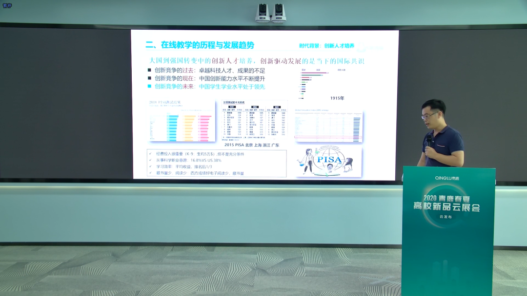 劉廣博士圍繞“后疫情時代,教學改革的趨勢與學習空間建設實踐”這一話題,針對“COVID-19疫情的影響”、“在線教學的歷程與趨勢”、“學習空間的標準化建設”三大主題為大家進行了詳細的講述。疫情之下的教育教學如何展開,成為了眾多教育者思考的問題。教育行業整體在這時遭遇了危機,線上教育則迎來了在變局中開新局的重要機會。隨著科技的快速發展,傳統的線下教育顯露出了諸多弊端,例如教育制度僵化、同質化和缺乏個性化以及大班教學的方式抑制了學習的個性化和學習的廣度。通過線下與線上教育相結合的方式,這一系列弊端將會漸漸被革除,這樣做最直接的受益者是受教育者與教育者雙方:教育者通過信息技術的支持對受教育者進行靈活化的教學,受教育者也在其中進行個性化的學習。這樣靈活的教學與個性的學習,將使受教育者的創新思維逐步得到培養,也將大大提高受教育者的創新水平。在國家發展中,從大國到強國的轉變中,創新人才的培養、創新驅動的發展成為當下的國際共識,通過多組數據分析,劉廣博士從我國創新競爭的過去講述到創新競爭的未來。在未來,中國學生學業水平將處于領先地位。而在這一發展變化過程中,線上教育的介入,智慧課堂的建設發揮了不容忽視的作用。未來教育的發展將展現新的教學生態,主要體現在“全體、全人、全流程”,教學目標將鎖定在培養學生的核心素養與創新能力,教學技術將需要富媒體、數據支持、AI的幫助,這一切都與青鹿產品的設計理念不謀而合。當前,我國出臺了相關法典--《中華人民共和國標準化法》,里面包含了12項教育行業標準,針對教育信息化、智慧教學、多媒體教學等都提出了相關要求。從這一切不難看出,線上教育在適應著教育發展新趨勢。