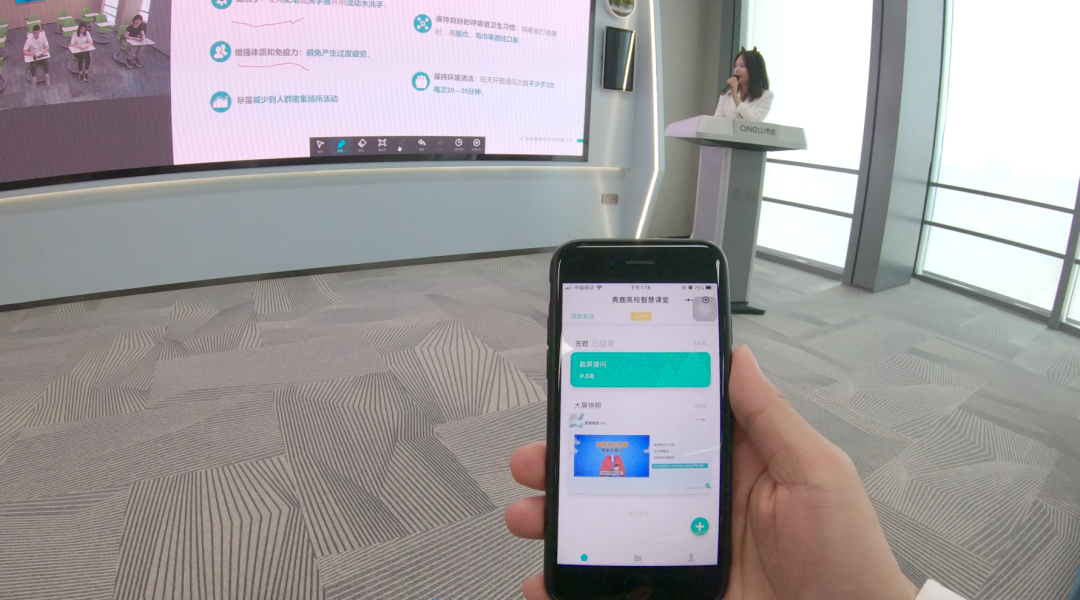 在次日的智慧教學示范空間·云參觀直播中,青鹿的工作人員帶領大家參觀了青鹿線下的智慧課堂,向觀眾們介紹了青鹿各項線上技術平臺。其中,線下的智慧課堂包括“手機互動智慧教室”、“多點互動智慧教室”以及“研討互動智慧教室”,手機互動與多點互動智慧教室具有操作簡單易上手、主流設備無障礙接入、跨校區遠程互動等特色功能,完美解決了多校區師資不足、遠程聯合辦學等教學問題。而研討互動智慧教室則使小組討論式學習更加高效,學生通過各項移動設都可以參與到課堂當中,學生與老師之間思維的碰撞,使得課堂充滿活力。在這其中,工作人員還向我們介紹了“青鹿智慧學習島”,通過學習島,老師與學生之間可以高效分享知識,深度探討內容。另外,在研討互動智慧教室中,無論是各個大中小屏,還是窗簾、空調都可以通過教室中的管控設備進行操控,以此來滿足老師授課時的各項需求。
