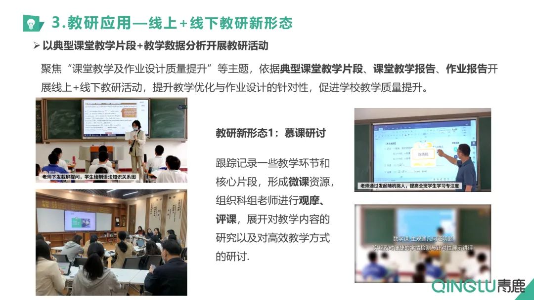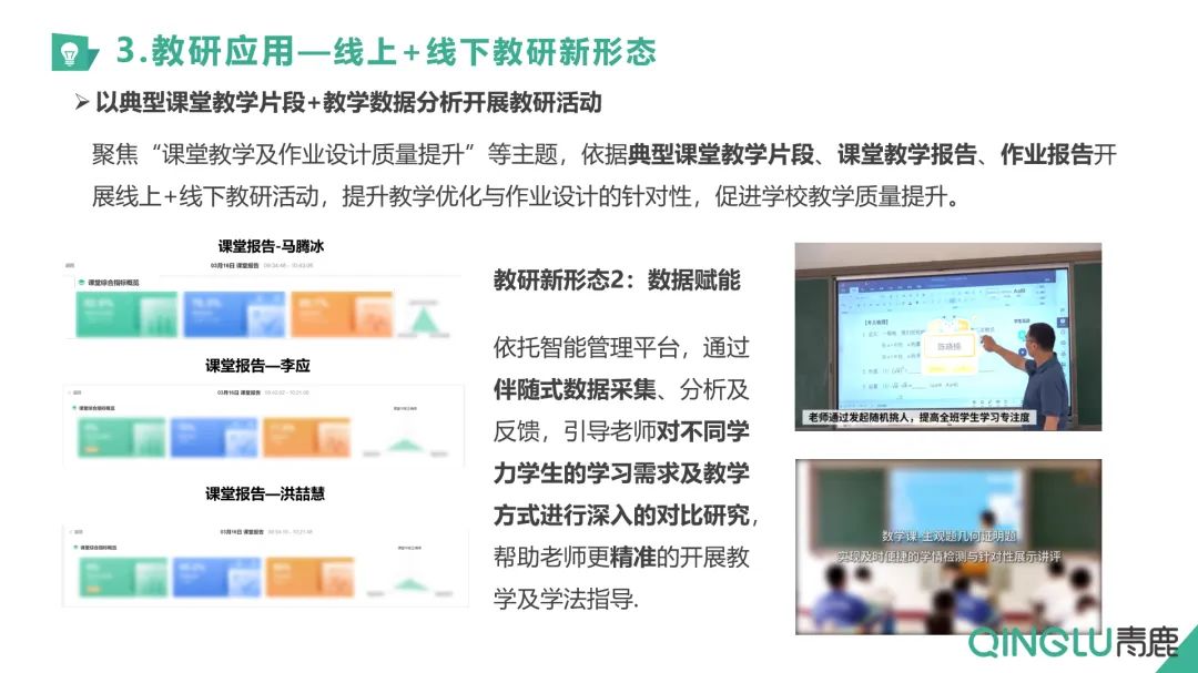 在賦能新教學方面,馬副主任主要從課堂的“新課導入”“新知講授”“測驗檢測”“總結歸納”等不同環節展示了青小鹿智慧紙筆應用下課堂教學的變化,不同學科的錄課實例吸引了與會嘉賓們的關注與熱烈反響。