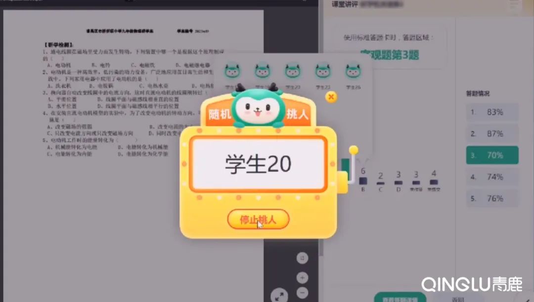 系統(tǒng)支持老師對(duì)作答某一選項(xiàng)的學(xué)生進(jìn)行隨機(jī)挑人互動(dòng),老師可以有針對(duì)性地發(fā)起提問,了解學(xué)生的作答思路,及時(shí)釋疑解惑,提高教學(xué)效率。