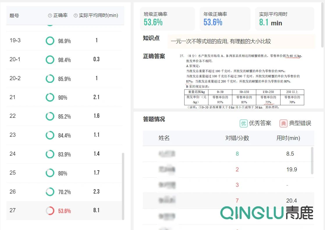 在青鹿智慧作業(yè)的作業(yè)試題分析模塊,精準(zhǔn)反饋每道作業(yè)題目的正確率,提示教師需重點(diǎn)關(guān)注的班級(jí)共性薄弱知識(shí)點(diǎn)等,教師能夠更加精準(zhǔn)地了解學(xué)生知識(shí)盲區(qū)。