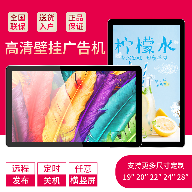 產(chǎn)品詳細(xì)介紹1)單機(jī)、網(wǎng)絡(luò)版兩種可選,支持分屏播放 2)單機(jī)插入U(xiǎn)盤(pán),直接拷貝,自動(dòng)播放 3)網(wǎng)絡(luò)版可連接wifi,支持遠(yuǎn)程發(fā)布 4)壁掛機(jī)有蘋(píng)果款(在奶茶店,飯店等地常見(jiàn))分眾款(在電梯常見(jiàn))超窄金邊款,觸摸款