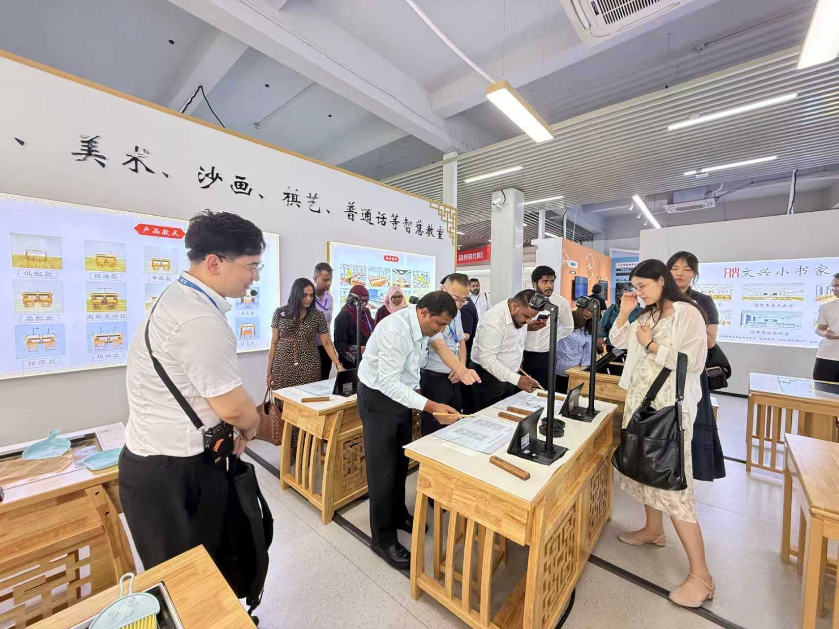 2025年6月30日上午,陽光明媚,充滿了友好與合作的氛圍。馬爾代夫部級官員研討班部長一行來到文興小書家產品展示區,對書法、美術、棋藝、沙畫教室相關產品進行了深入考察,開啟了一場別開生面的國際友好交流之旅。