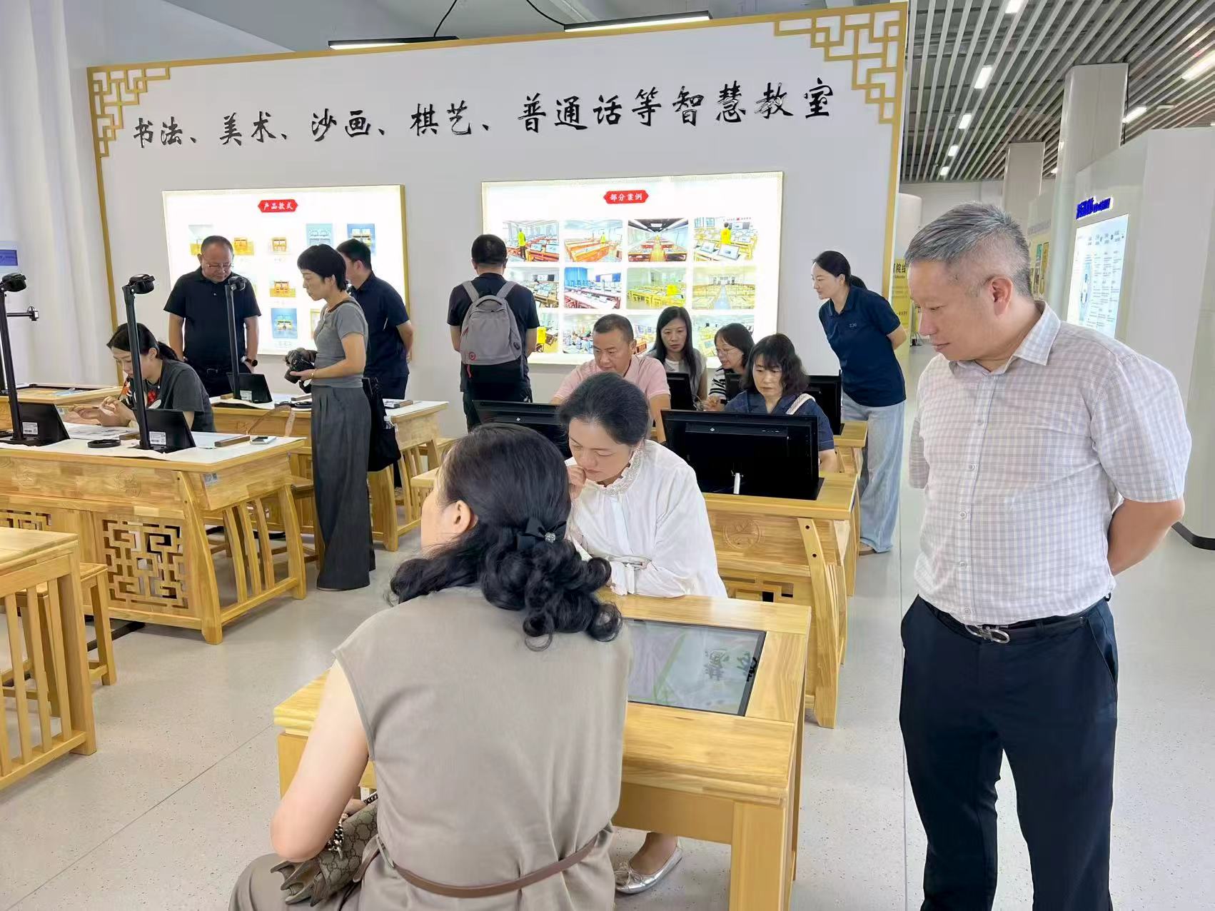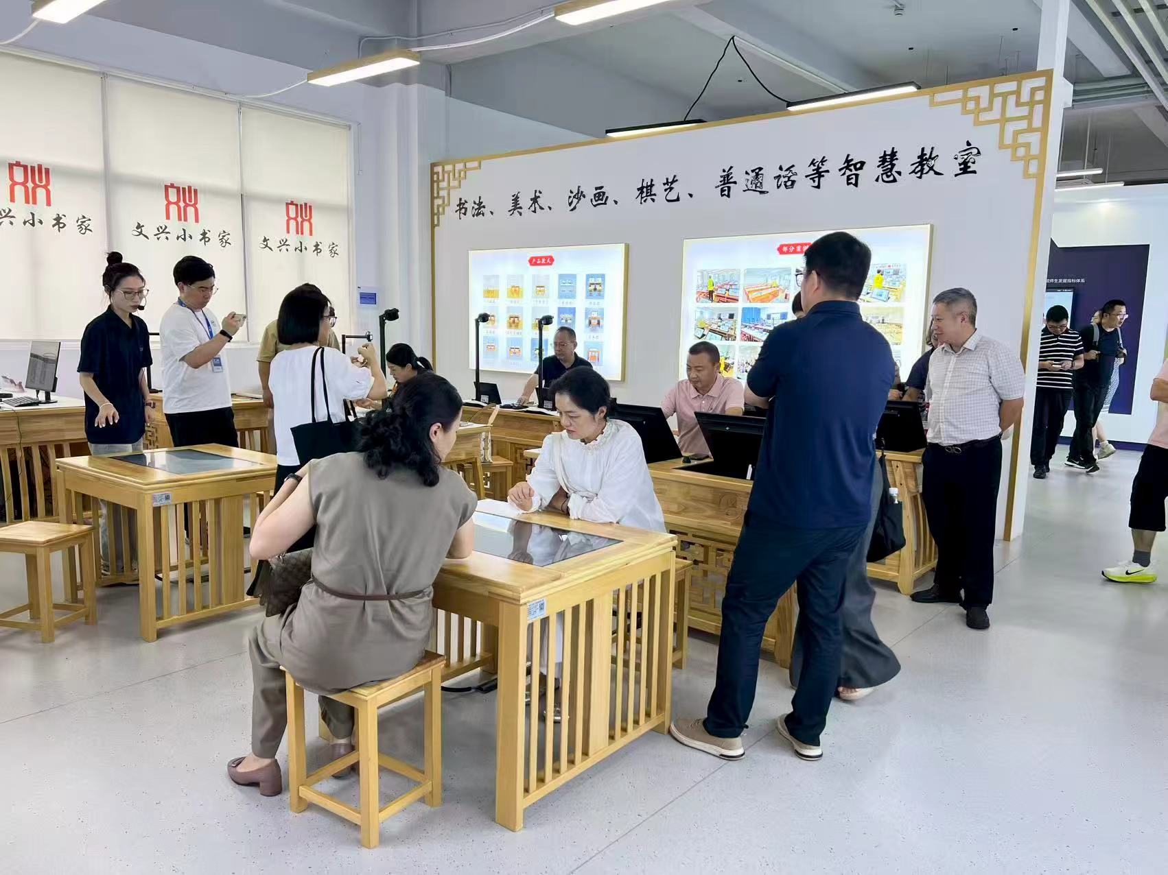 在文興小書家相關負責人的陪同下,蒼溪縣職業高級中學的領導和教師團隊依次參觀了智慧書法教室、智慧美術教室、數字棋藝室以及沙畫創新教室等多個展示區域。每一款產品都蘊含著前沿科技與傳統教育的深度融合,充分體現了文興小書家在教育裝備領域的專業性和創新性。