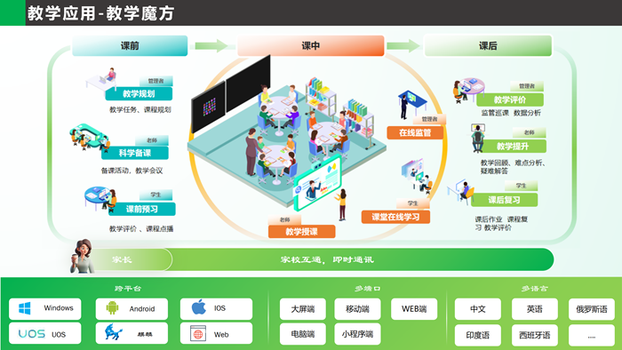 現場,安道除了展出了新的智慧教學設備外,還亮相了新的自研智慧教學應用軟件「安道教學魔方」。教師在使用教學魔方時,可以借助AI實現一鍵快速備課,生成課件,還支持生成跨學科內容。作為高效賦能教學的多功能教學軟件,教學魔方為管理者、教師、學生、家長多用戶提供電腦端、移動端、小程序、網頁等多終端提供全面的教學輔助平臺,能夠結合其他自研教學工具,貫穿課前、課中、課后三大教學環境全流程,豐富教學功能和模塊,靈活組合,實現個性化課堂教學設計及信息資源流通共享,進一步提高教學質量。