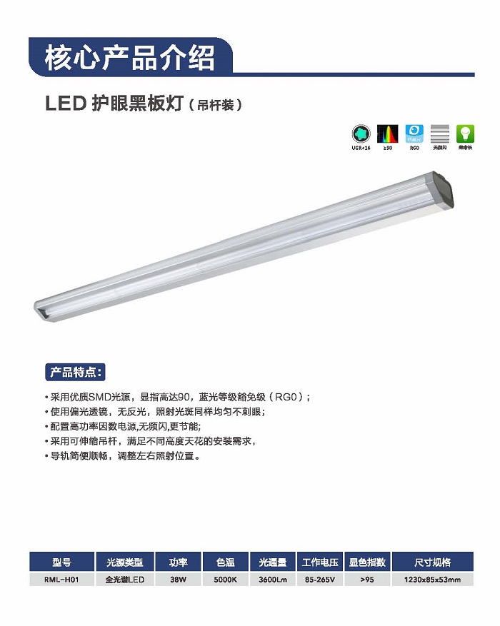 LED護(hù)眼黑板燈(吊桿裝)產(chǎn)品特點(diǎn):