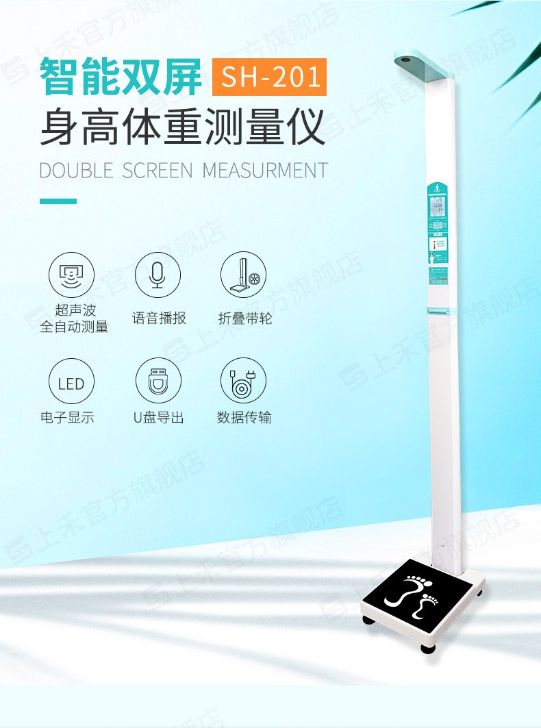 產(chǎn)品詳細(xì)介紹 參數(shù):*超聲波無接觸測量身高、潔凈、衛(wèi)生,測量速度快,測量精度高,外觀豪華上檔次; *數(shù)據(jù)輸出格式:提供RS232接口,并提供飲食健康建議,方便用戶關(guān)注體重對健康的影響; *自檢測功能:具有開機自檢功能,自動檢測身高和體重是否連接正常,如有異常并自動平判定異常原因; 體型:自動計算BMI指數(shù),并判斷BMI指數(shù)范圍; 體重測量方式:精密平衡梁電阻應(yīng)變式壓力傳感器稱重 身高測量方式:超聲波測量技術(shù)(采用高精度超聲波傳感器并實現(xiàn)溫度補償功能)。 *測高范圍:20-210cm, 鑒定精度:±0.5cm 分度值:0.5cm或0.1cm可調(diào) *稱重范圍:2.0-500KG,鑒定精度:±0.1kg 分度值:0.1kg或0.01kg可調(diào) 測重傳感器:高精度度、高靈敏、高性能精密平衡梁式壓力傳感器; BMI:正常范圍19-24.9,采用最新的WHO標(biāo)準(zhǔn)或中國九城市標(biāo)準(zhǔn),自動計算BMI數(shù)值; BMI精度:可根據(jù)客戶要求自由設(shè)置BMI精度0.1或0.01可調(diào) *雙液晶屏顯示:*采用兩個高清液晶屏顯示: 5寸高清液晶屏待機狀態(tài)下顯示當(dāng)前日期、時間和溫度,測量完畢后屏幕顯示身高、體重、BMI的測量結(jié)果以及體型偏胖、正常還是偏瘦。 3寸液晶屏上待機狀態(tài)下顯示用戶單位名稱(比如:某某省人民醫(yī)院)和歡迎語;測量狀態(tài)下顯示測量姿勢提示語,測量完畢后顯示理想體重、健康體重范圍以及飲食建議,另外還可以掃屏幕上的二維碼,測量結(jié)果直接發(fā)送到用戶手機上(選配)。 大字體超高清顯示,非常方便醫(yī)護(hù)人員查看測量結(jié)果 。 *自動語音播報:清晰語音報出測量數(shù)值并且客戶可以根據(jù)使用情況設(shè)置提示語音。 *數(shù)據(jù)輸出:提供RS232接口(標(biāo)配),方便連接電腦;也可以支持藍(lán)牙模塊(此功能為選配) *測量速度:快速測量600次/小時。 機身可折疊:折疊后高度為1.2米方便運輸和移動 電源:采用AC100V-240V電源,輸入寬電壓適合電壓不穩(wěn)定地區(qū)。 消耗功率:待機10W,工作時平均15W。 工作環(huán)境:溫度:-10℃至+40℃, 濕度:20%-85%PH。 推薦使用:醫(yī)院、社區(qū)服務(wù)站、疾控中心、體檢中心、養(yǎng)老中心,企事業(yè)單位等部門和單位;