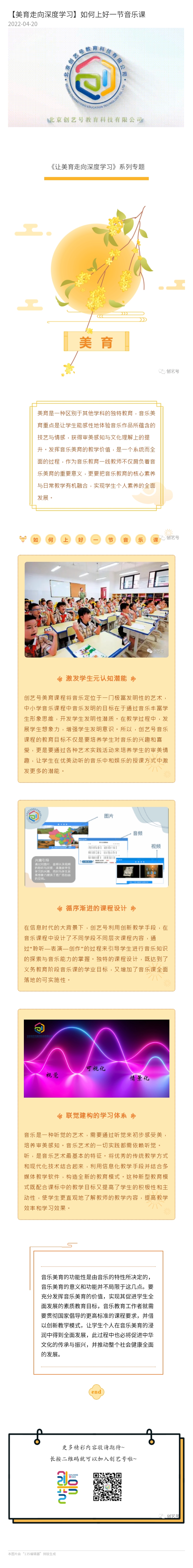 區域美育整體解決方案。創藝號美育綜合建設方案,做到“三建設,三提升”,建設美育創新型課程模式,提升區域整體教學能力;建設美育發展性評價體系,提升學生藝術綜合素養;建設美育專業化場地課程,提升學校優質特色發展,有效服務美育進校園、進中考。