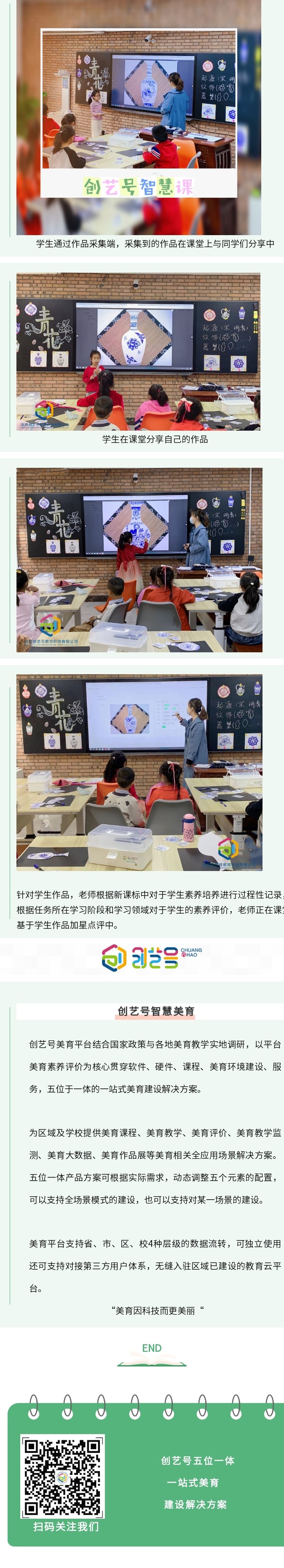 | 區(qū)域美育整體解決方案。創(chuàng)藝號(hào)美育綜合建設(shè)方案,做到“三建設(shè),三提升”,建設(shè)美育創(chuàng)新型課程模式,提升區(qū)域整體教學(xué)能力;建設(shè)美育發(fā)展性評(píng)價(jià)體系,提升學(xué)生藝術(shù)綜合素養(yǎng);建設(shè)美育專業(yè)化場(chǎng)地課程,提升學(xué)校優(yōu)質(zhì)特色發(fā)展,有效服務(wù)美育進(jìn)校園、進(jìn)中考。 |
