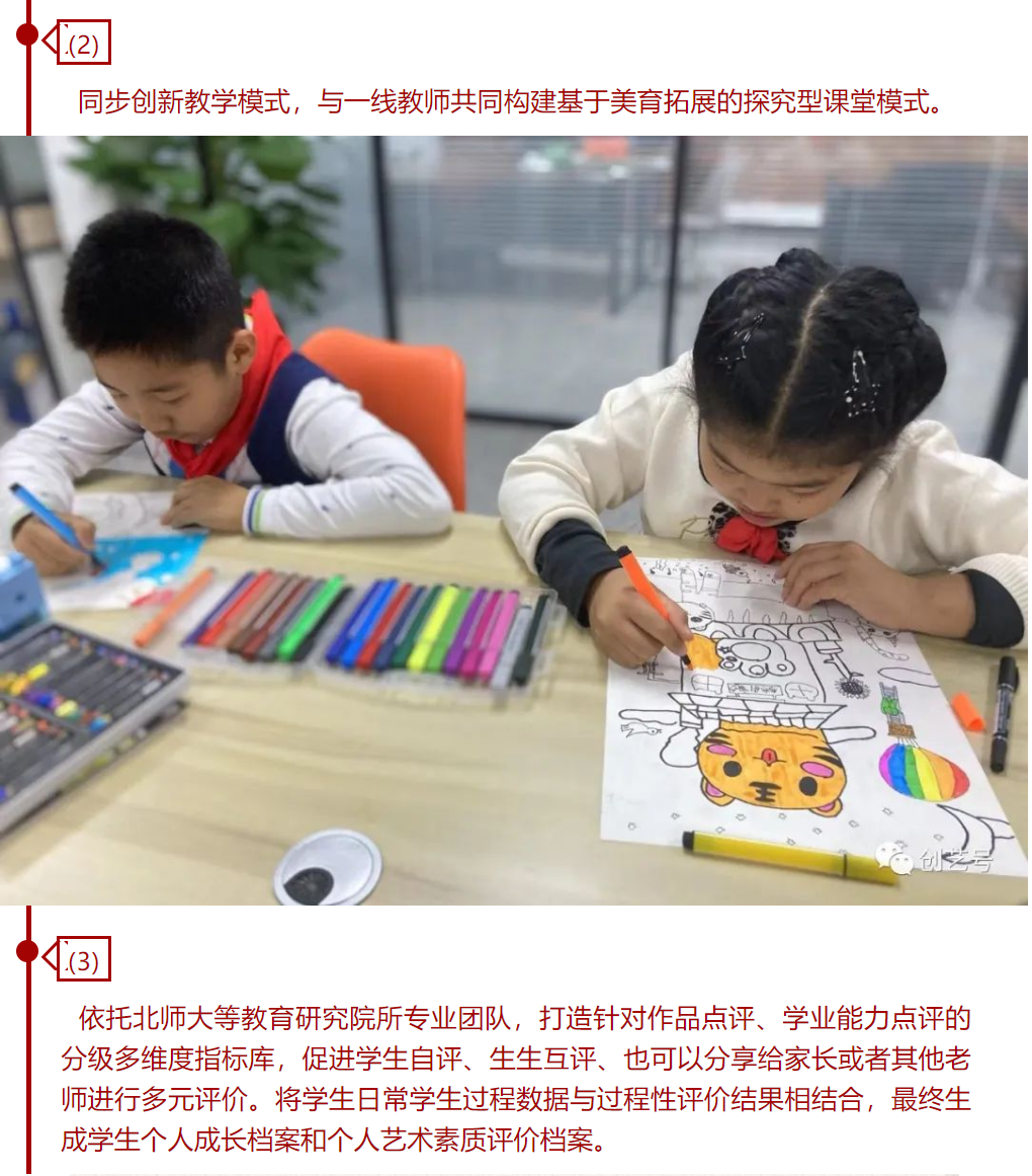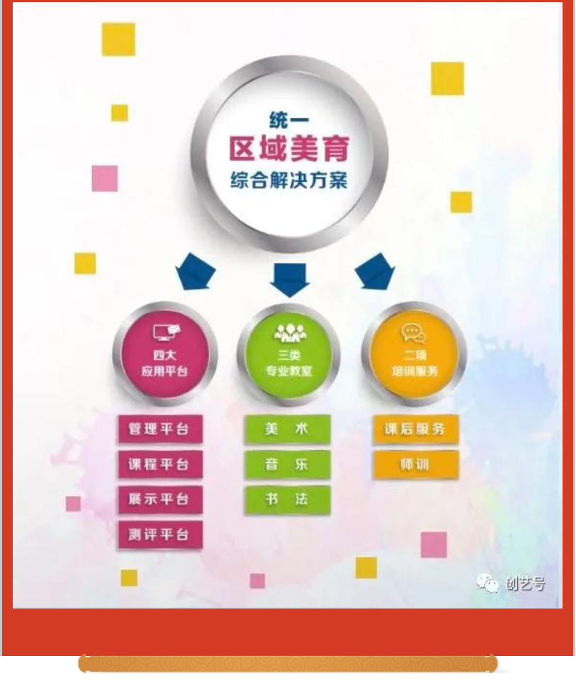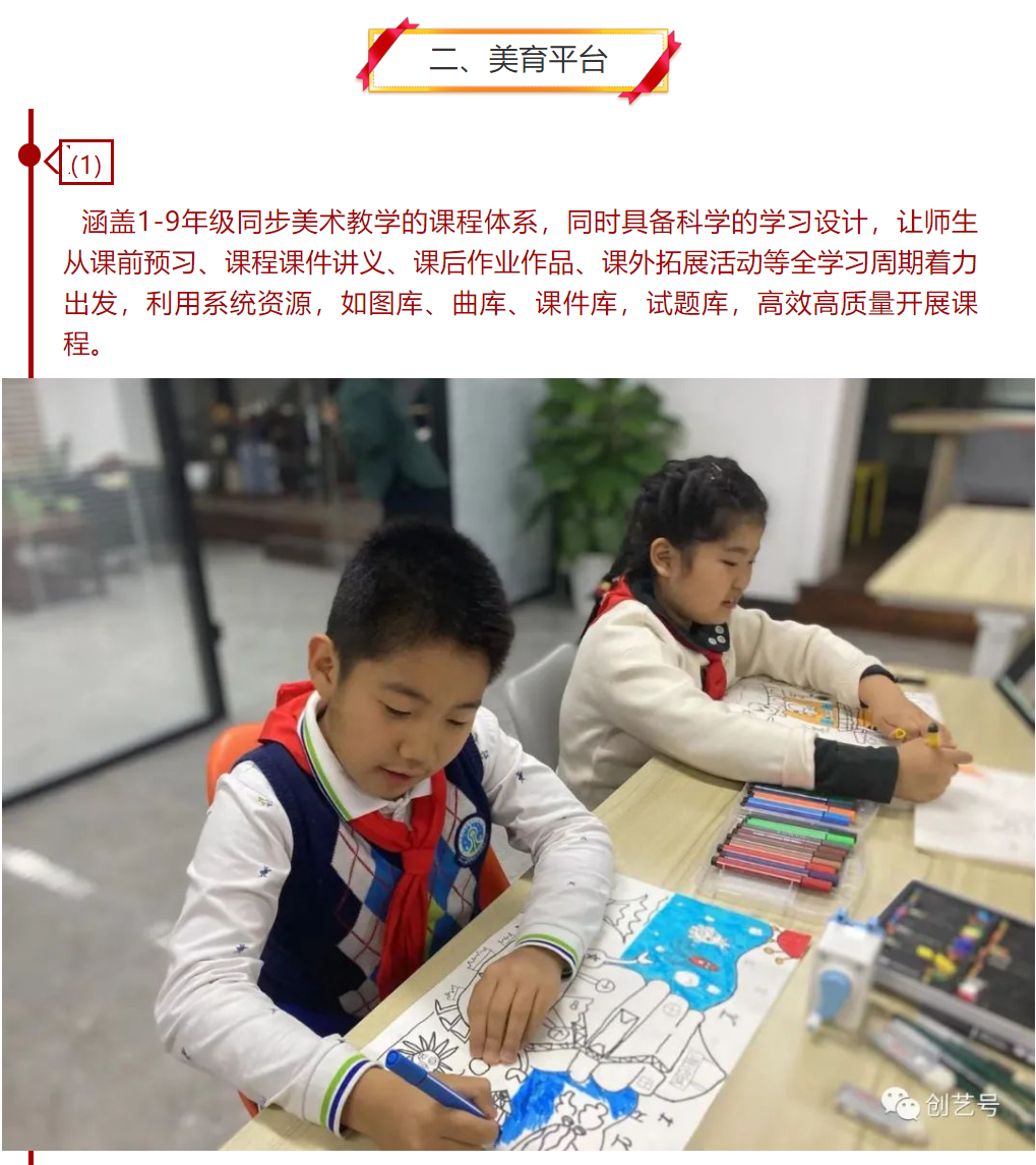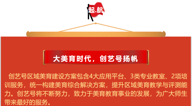 區域美育整體解決方案。創藝號美育綜合建設方案,做到“三建設,三提升”,建設美育創新型課程模式,提升區域整體教學能力;建設美育發展性評價體系,提升學生藝術綜合素養;建設美育專業化場地課程,提升學校優質特色發展,有效服務美育進校園、進中考。