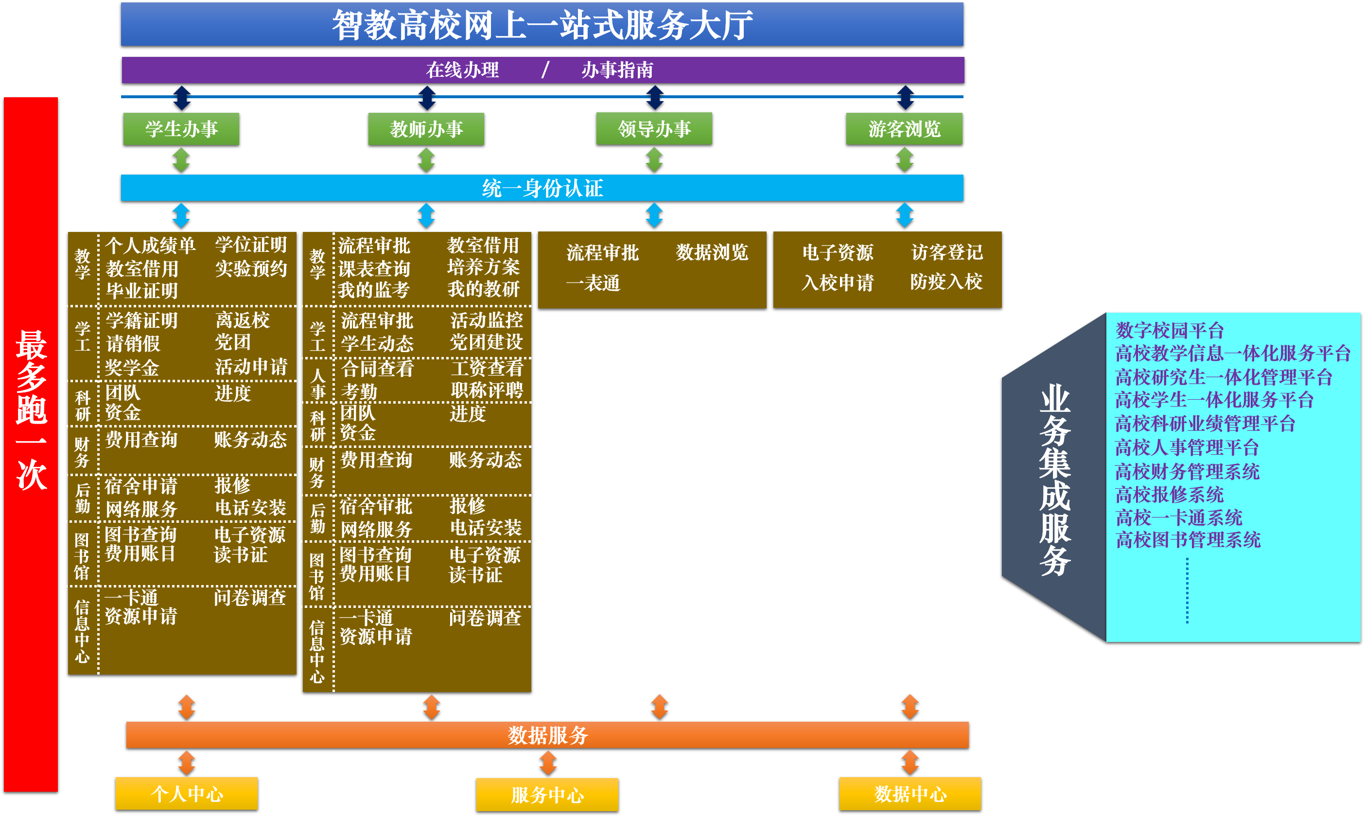 產品詳細介紹高校網上一站式服務大廳,充分考慮每個學校的管理模式不同,每個學校相似業務部門的業務系統不同,前瞻性設計微服務架構下的一站式服務大廳,打造為每個學校的學生、教師、領導量身定制一站式網上辦事,解決廣大師生在學習、生活、科研過程中遇到的各種困難,改變師生遇到問題不知如何處理、如何辦理的情況,更高質量的實現高校師生管理理念由“管理型”向“服務型”的轉變,提升學校到一個新的水平和層次。 |