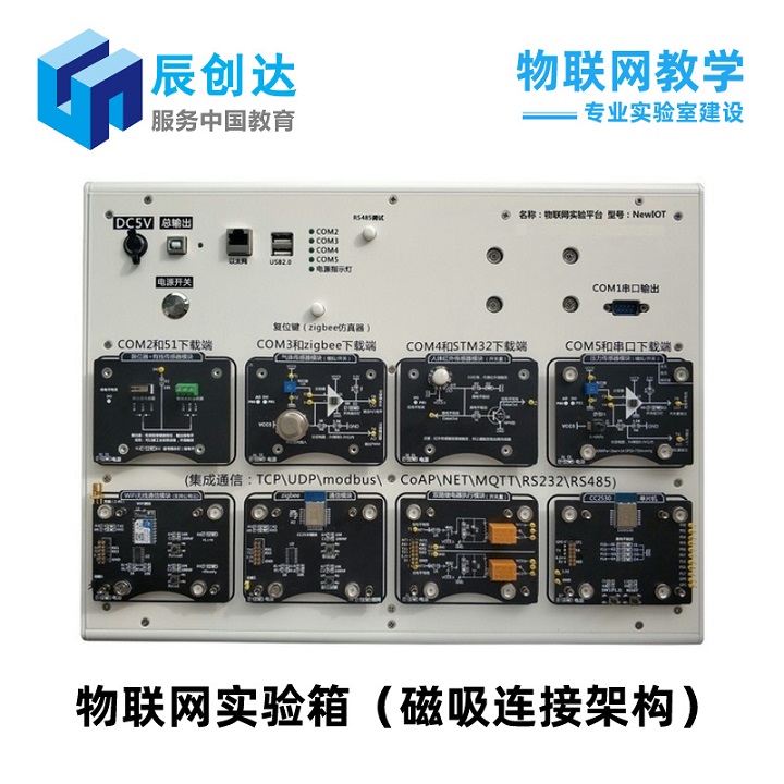 物聯網綜合實驗平臺是一款面向電子信息、計算機及物聯網專業的教學實驗實訓設備,主要由實驗平臺、實驗模塊、實驗軟件、云平臺、實驗開發工具及電子實訓指導書六部分組成,實驗平臺配置高性能的主板及各種拓展接口,并多達幾十種物聯網模塊和傳感器模塊可供選擇,模塊均采用磁吸式接口設計,直接吸附到實驗平臺對應插槽內即可直接使用,無需額外接線,學生可以任意搭接模塊進行實驗,完成物聯網基礎知識學習以及復雜的多模塊聯網實驗,拓展性強。