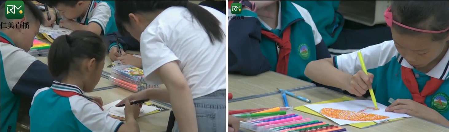 四年級的孩子正通過“仁美直播”與城區(qū)鹽津二小的師生共享美術課堂