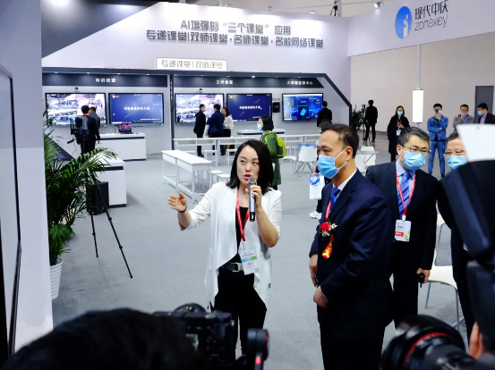 開展首日,國家督學、北京市高等教育學會會長線聯平、北京市高等教育學會常務副會長王曉純等領導蒞臨現代中慶展位,考察現代中慶AI教育的最新應用成果。
