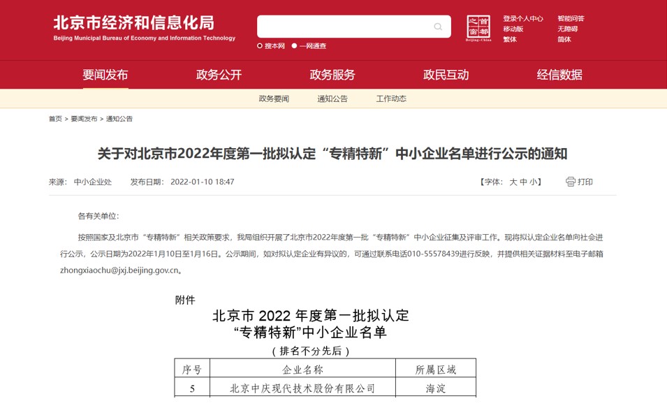 近日,北京市公布了2022年度第一批擬認定“專精特新”中小企業(yè)名單。致力于人工智能創(chuàng)新、專注以技術服務教育的北京中慶現代技術股份有限公司成功入選名單。