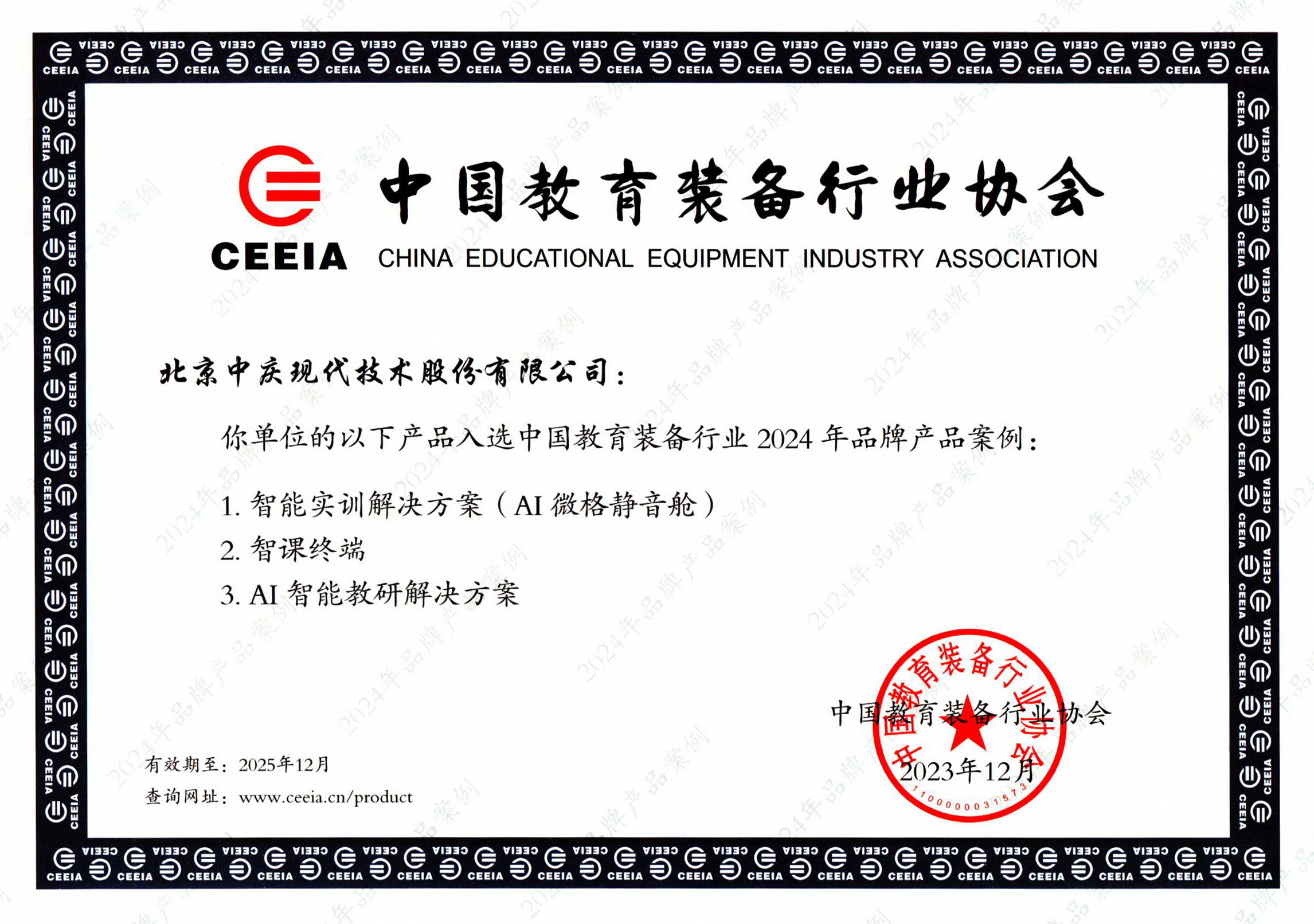 中國教育裝備行業(yè)協(xié)會落實國家發(fā)改委“品牌協(xié)會成長計劃”,開展中國教育裝備行業(yè)品牌企業(yè)和品牌產(chǎn)品征集評選活動。現(xiàn)代中慶在去年底榮獲品牌企業(yè)榮譽后,3款教育AI產(chǎn)品再次獲選“中國教育裝備行業(yè)2024年品牌產(chǎn)品”。