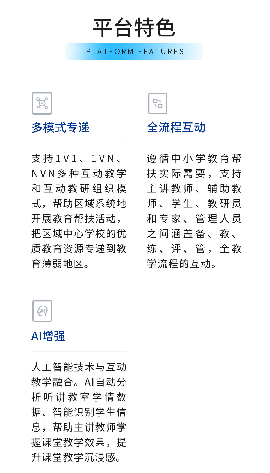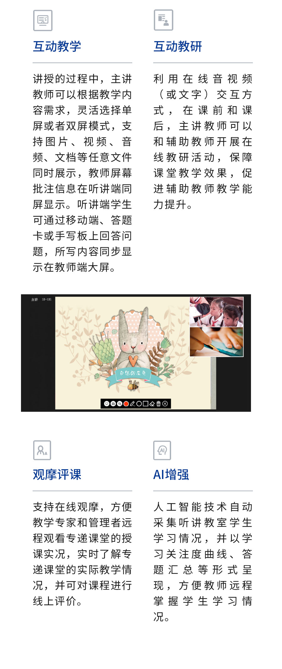| AI教研應用、錄播系統(tǒng)、智慧教室、“三個課堂”解決方案等 |