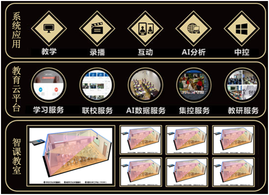 中慶智課整體架構如下圖所示,主要包含智課教室建設、教育云平臺建設,共提供教學、錄播、互動、AI分析及中控等應用。