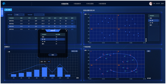 系統可以與學校考試系統進行對接,通過對學生個體考試成績與課堂關注度的關聯分析,系統可以繪制出學生成績與課堂參與度的四象限散點分布圖。