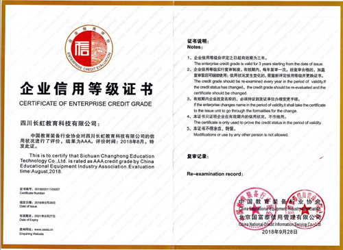 “全國(guó)質(zhì)量誠(chéng)信標(biāo)桿典型企業(yè)”稱號(hào),又獲悉,中國(guó)教裝備行業(yè)協(xié)會(huì)和信用評(píng)價(jià)工作委員會(huì)聯(lián)合發(fā)布了“關(guān)于公布2018年中國(guó)教育裝備行業(yè)協(xié)會(huì)企業(yè)信用等級(jí)評(píng)價(jià)結(jié)果的通知”(教信評(píng)文【2018】4號(hào)文件),長(zhǎng)虹教育憑借誠(chéng)信經(jīng)營(yíng)和規(guī)范管理,從多家參評(píng)企業(yè)中脫穎而出,榮膺全國(guó)教育裝備行業(yè)“AAA級(jí)信用企業(yè)”稱號(hào)。