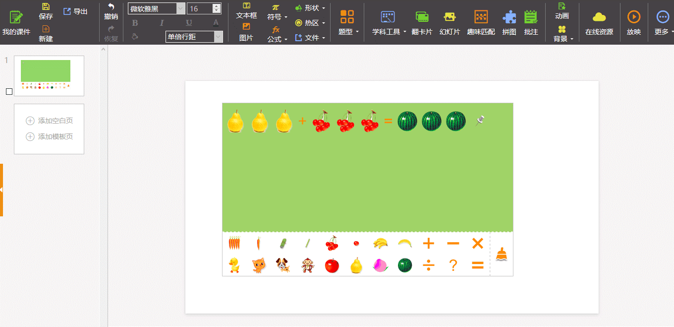 在課件模式下,老師可以自行創(chuàng)建課件,隨時插入在線資源中的現(xiàn)成課件、試題、各種學科工具,調(diào)動課堂氛圍的互動教學游戲等。