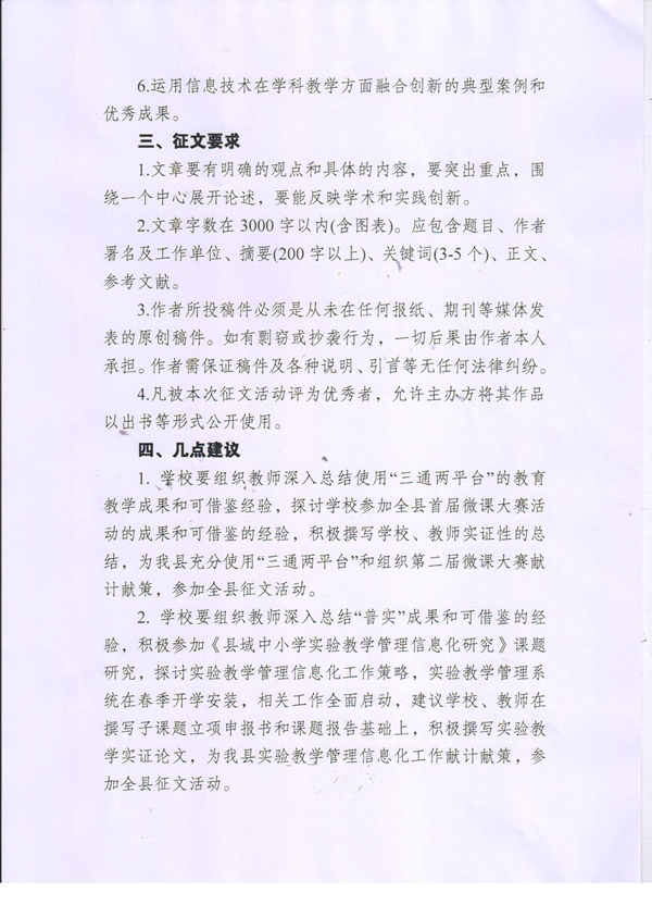 1. 學校要組織教師深入總結使用“三通兩平臺”的教育教學成果和可借鑒經驗,探討學校參加全縣首屆微課大賽活動的成果和可借鑒的經驗,積極撰寫學校、教師實證性的總結,為我縣充分使用“三通兩平臺”和組織第二屆微課大賽獻計獻策,參加全縣征文活動。