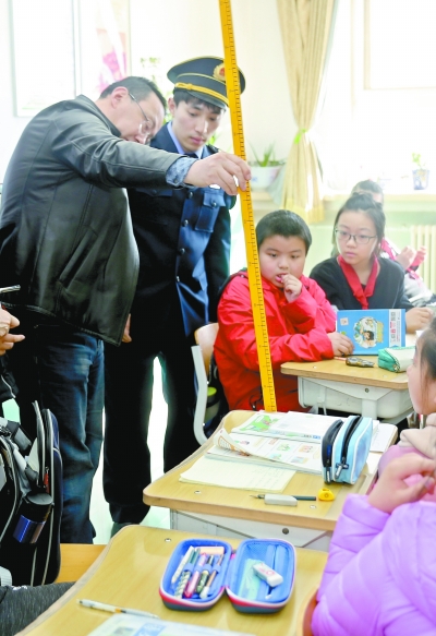 3月7日,在北京市通州區教師研修中心實驗學校,衛監所工作人員正在與校方共同測量學生課桌面高度。記者 方非攝