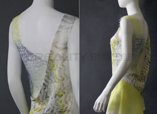 第二個是 Sun為這項研究所采取的路線,其重點是“視覺幻覺的靈感”。太陽融合了有機形式,融合在一起看起來像蕾絲,在原型服裝中,具有精致的軀干和裙子部分,這款喇叭形真絲半身裙采用不對稱下擺設(shè)計。這件連衣裙的軀干部分融合了兩個數(shù)字設(shè)計應(yīng)用,內(nèi)襯絲綢電力紡,作為最基本的平紋真絲織物之一,并且不需要拉鏈形式的額外封口。