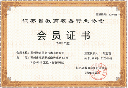 近日,蘇州數(shù)言喜獲中國教育裝備行業(yè)協(xié)會、江蘇省教育裝備行業(yè)協(xié)會頒發(fā)的會員證書。正式成為協(xié)會一員,標(biāo)志著蘇州數(shù)言在教育裝備領(lǐng)域步入一個新的臺階,是對我們過去在教育裝備行業(yè)工作中的肯定與支持,也是對公司全體工作人員未來的鼓勵。