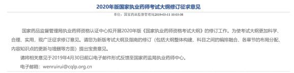 你們知道么,國(guó)家藥品監(jiān)督管理局網(wǎng)站3月11日發(fā)布信息:國(guó)家藥品監(jiān)督管理局執(zhí)業(yè)藥師資格認(rèn)證中心擬開展2020年版《國(guó)家執(zhí)業(yè)藥師資格考試大綱》的修訂工作。