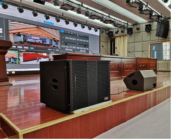 廳內主擴聲采用的是線性陣列音箱,主席臺/舞臺區左右各掛4只高精度全頻音箱,最大聲壓級130db,動態容量大、聲像定位準確、投射精準、音質優美;輔助音箱搭配的2只雙12寸遠射程強低頻效果的次低音和2只90°圓錐指向性舞臺返聽音箱。主輔的搭配完美解決臺前臺后各區域聲場分布不均勻,語言清晰度低,響度不夠的問題,在任何的演繹方式下都能擁有出色的表現力。