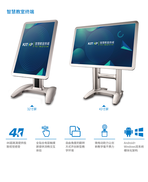 智慧教室終端專為智慧教室創新教學模式而設計,集多媒體教學、課堂錄播、考勤管理等多功能為一體,操作簡便。它包含了高清智能顯示、觸摸交互、白板書寫、遠程協作、大小屏互動、多屏聯動、智能語音交互、高級功能等應用于一體的新型課桌形態。教室內部署智慧教室終端即可建設成為現今教學活動中最先進、最完備的智慧教室。
