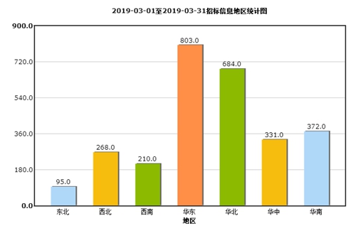 綜合3月全國招標采購信息量地區統計分析圖(如圖5所示):西南地區環比增長69.35%;華南地區環比增長64.60%;華東地區環比增長59.96%;華北地區環比增長49.34%;華中地區環比增長29.30%;西北地區環比增長24.07%;東北地區環比增長10.47%。
