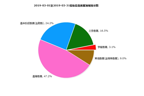 從3月招標采購信息所屬領域統計圖(如圖6所示)上看,學前教育占比為3.1%;義務教育占比為16.5%;高中階段教育(含職教)占比為24.2%;高等教育占比為47.2%;其他教育(含特殊教育)占比為9.0%。