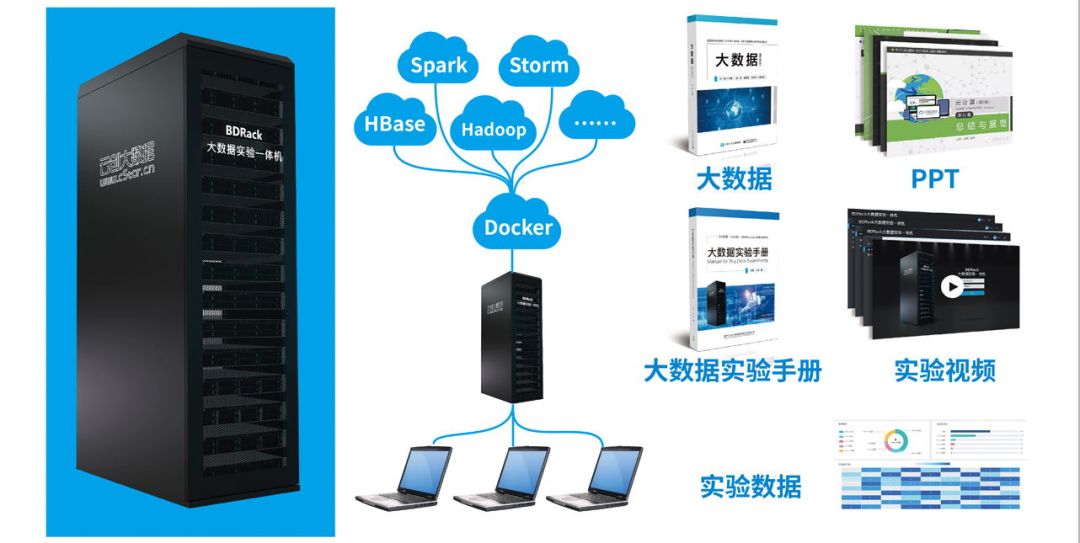 云創大數據實驗平臺與人工智能實驗平臺采用Docker容器技術,通過少量機器虛擬出大量的實驗機器,可供學生同時擁有多套集群進行基礎實驗。