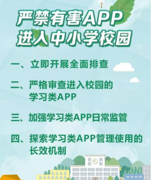 為營造良好的“互聯(lián)網(wǎng)+教育”育人環(huán)境,保障中小學(xué)生健康成長(zhǎng),教育部辦公廳在2019年1月2日印發(fā)了《關(guān)于嚴(yán)禁有害APP進(jìn)入中小學(xué)校園的通知》,要求各地采取有效措施,堅(jiān)決防止有害APP進(jìn)入中小學(xué)校園。通知指出,各地教育行政部門和中小學(xué)校要建立健全日常監(jiān)管制度,明確監(jiān)管責(zé)任和辦法,切實(shí)保障進(jìn)入校園的APP安全健康、科學(xué)適宜。強(qiáng)調(diào)要開展全面排查,凡發(fā)現(xiàn)包含色情暴力、網(wǎng)絡(luò)游戲、商業(yè)廣告及違背教育教學(xué)規(guī)律等內(nèi)容的APP要立即停止使用,要將涉嫌違法違規(guī)的APP、微信公眾號(hào)報(bào)告當(dāng)?shù)鼐W(wǎng)絡(luò)信息管理和公安部門查處,要采用多種方式提醒家長(zhǎng)慎重安裝使用面向中小學(xué)生的APP。