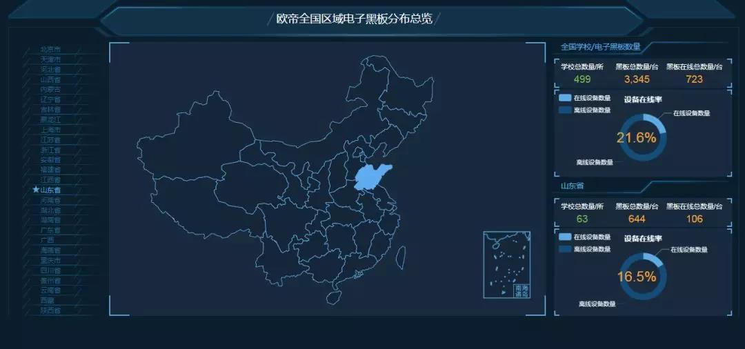 從整體來看,歐帝校園集中控制系統可以通過真實地圖查看學校的分布情況,查看全國或某個區域內學校和黑板總數,以及在線離線數,同時還可以掌握學校數量和黑板數量變化趨勢圖、常用軟件使用前10名、學校活躍排名、最近一個月的黑板在線數量。